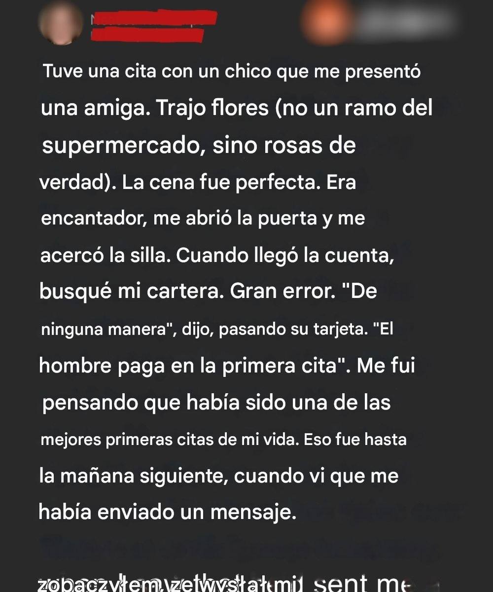 Cuando Eric me pidió que le pagara por nuestra primera cita, pensé que había conocido a un verdadero aristócrata. Rosas, un bonito regalo, una conversación interesante… lo tenía todo previsto. Cuando me escribió al día siguiente, esperaba un mensaje agradable, pero al leerlo, se me heló la sangre.